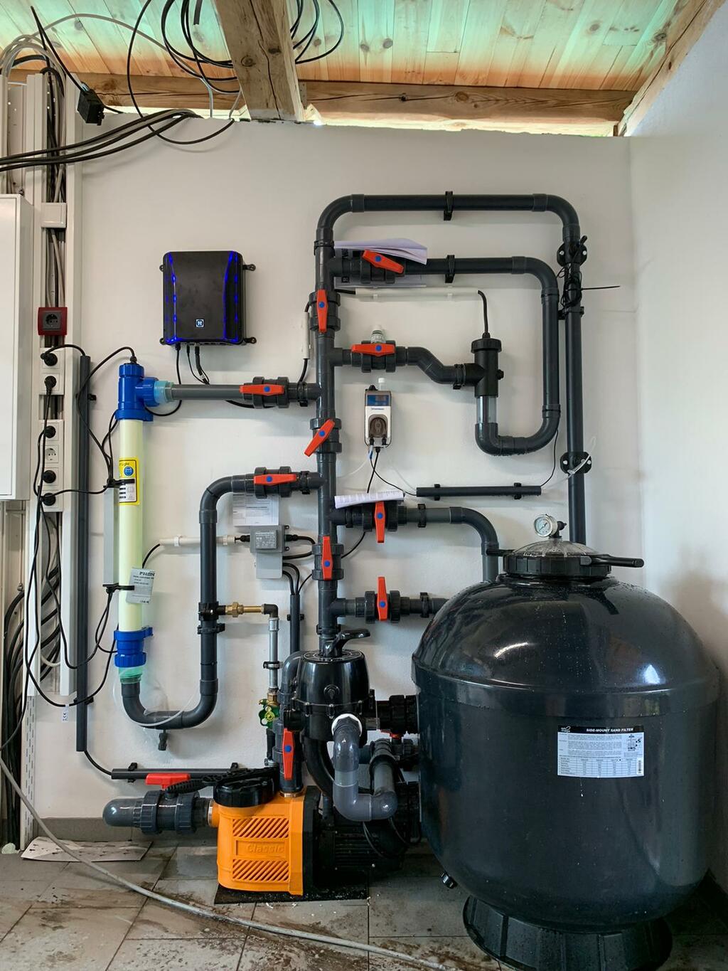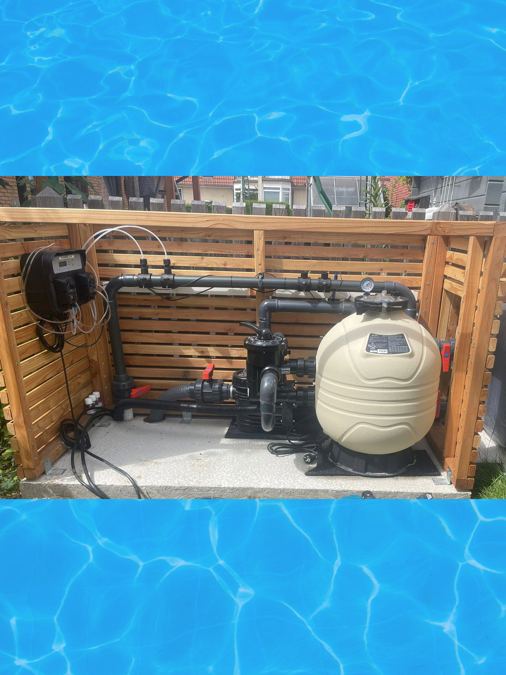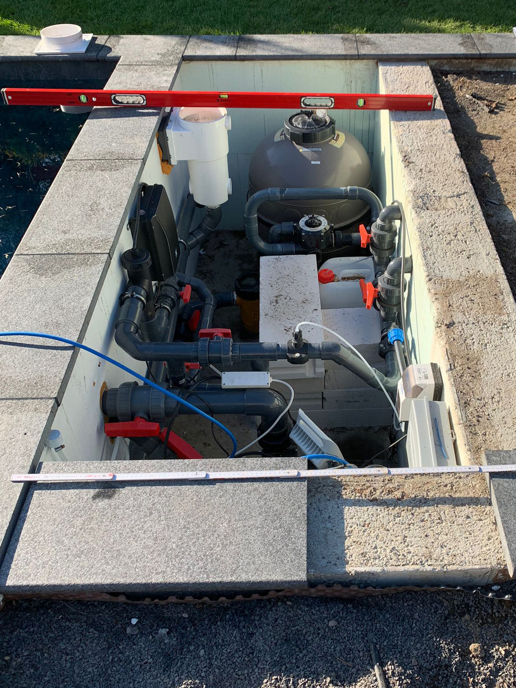 Die Wasseraufbereitung benötigt natürlich etwas Platz und kann unterirdisch in einem Schacht neben dem Schwimmbecken installiert werden oder oberirdisch in einer Technikbox, Schuppen oder dem Gartenhaus.