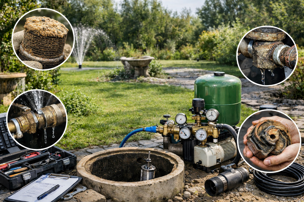 Häufige Ursachen sind zugesetzte Ansaugstellen, verschlammte Filterbereiche, undichte Saugleitungen, falsch eingestellte Druckschalter oder eine Pumpe, die nicht zum Brunnen passt.