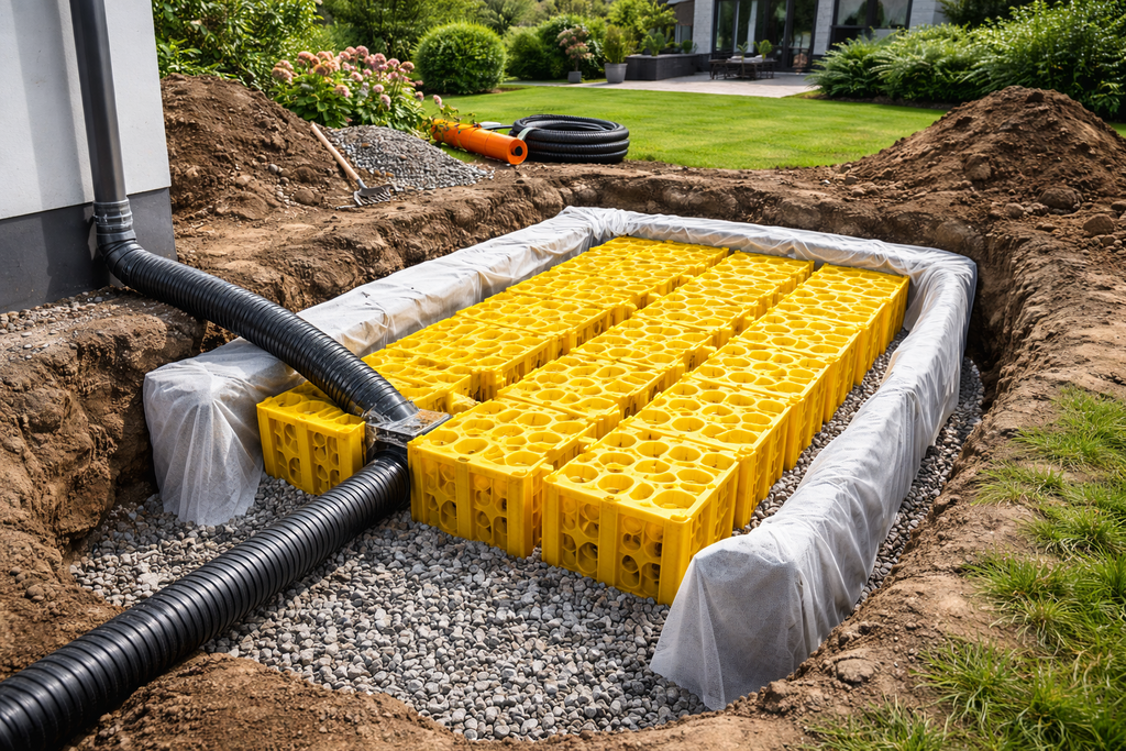 Versickerungsboxen leiten Regenwasser kontrolliert in den Boden, statt dass es auf der Fläche stehen bleibt oder die Kanalisation belastet.