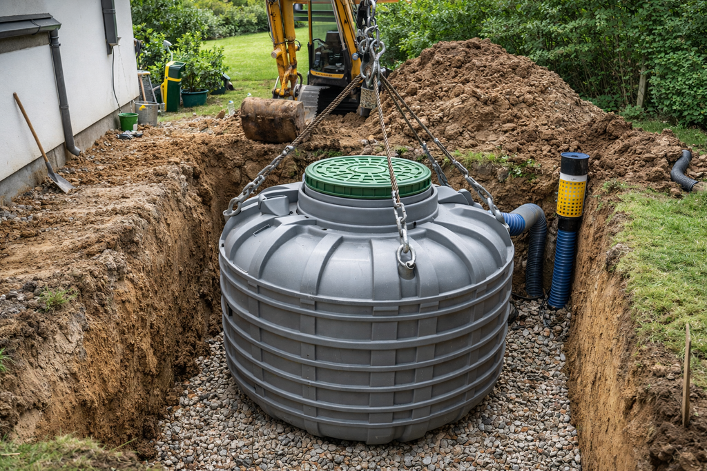Einbau der Zisterne (Kunststoff oder Beton – je nach Anforderung)